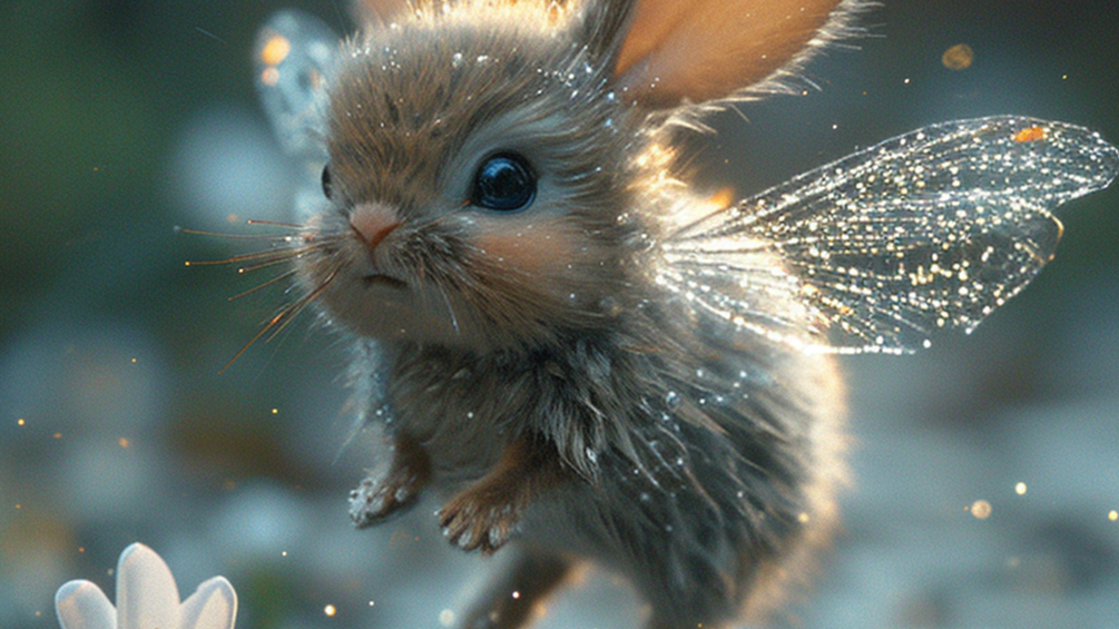 Behold the BreezeBunny, a fairy-tale creature as delicate as a whisper. With a coat of soft gray and subtle hints of lavender, and eyes reflecting the tender blue of the sky, this tiny rabbit with dragonfly wings flutters above a pond, adding a touch of magic to the twilight garden. Its rapid wingbeats are a gentle hum, a balletic display of aerial grace in the serene embrace of dusk.