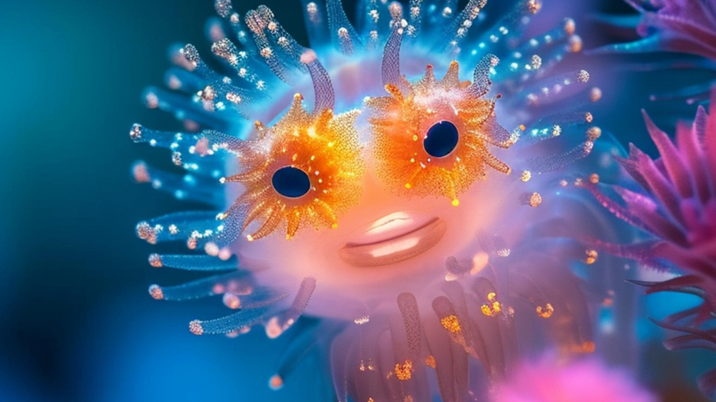 Dive into the azure embrace of the ocean and meet the BubbleSprite, a whimsical embodiment of underwater playfulness. With its jelly-like body glistening like a cluster of sunlit dewdrops, this tiny denizen of the deep gazes out with eyes full of curiosity and wonder. Frolicking amongst the coral, it mirrors the vibrant tapestry of sea life, a tiny beacon of joy in the vast blue.