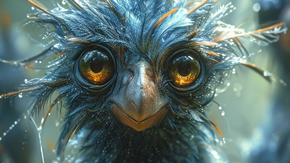 Meet the FeatherSprites, ethereal inhabitants of the misty morning woods. These tiny, bird-like beings dazzle with feathers in iridescent blues and greens. With eyes full of wonder, they dance through dew-laden webs, their playful antics a delight to behold. This scene, set in the soft glow of dawn, captures the essence of their lively spirits and the mesmerizing play of light on their delicate feathers.