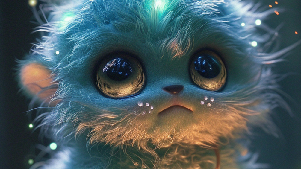 Introducing the GlowPuff, an enchanting forest dweller that resembles a whimsical ball of fluff. Bathed in the moon's glow, this tiny creature's bioluminescent fur sparkles in mesmerizing blues and greens. Its large, bright eyes enhance its endearing gaze, inviting you into a peaceful, dreamy world. Captured in the tranquility of a moonlit forest, the GlowPuff is a heartwarming spectacle of nature's gentle luminescence.